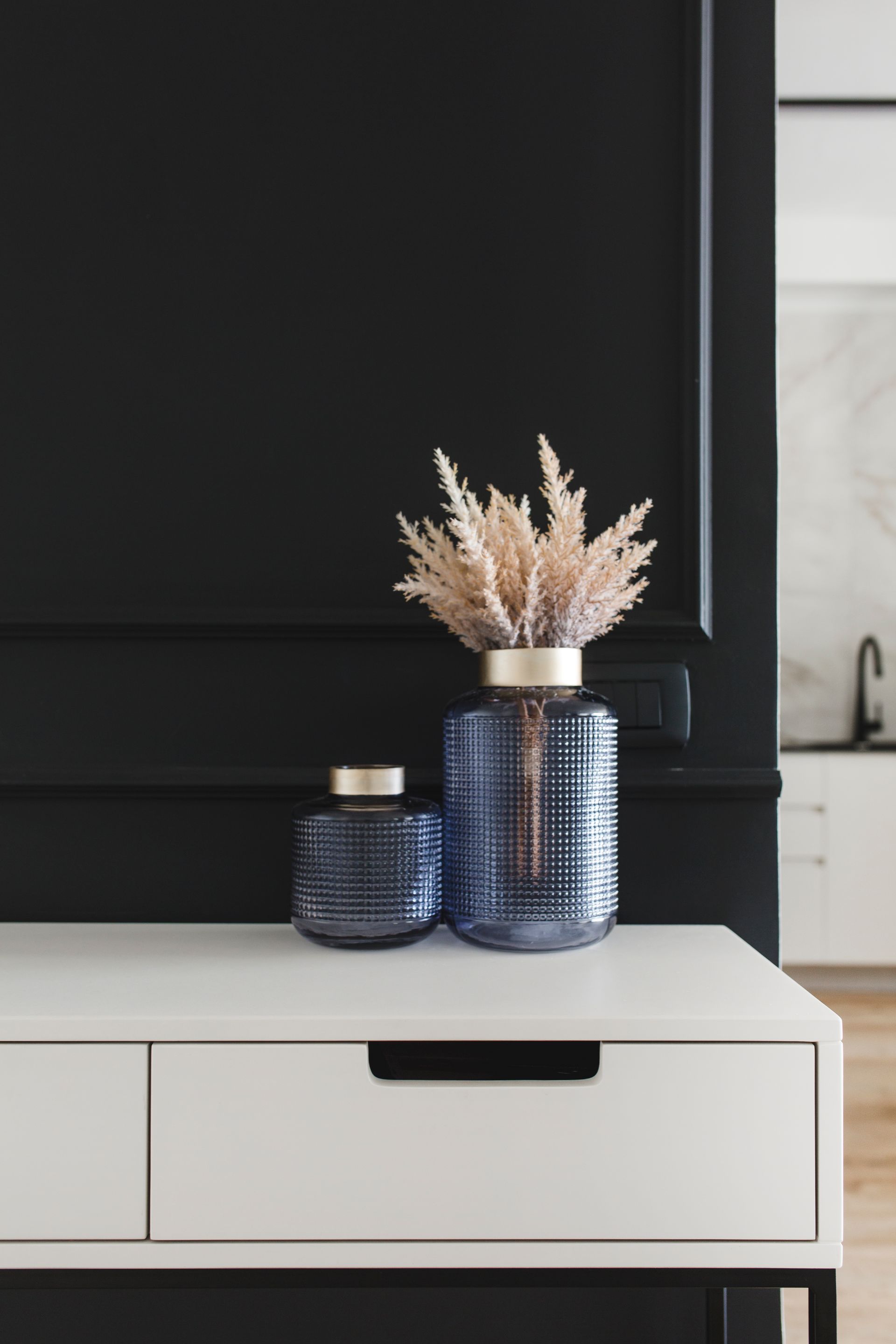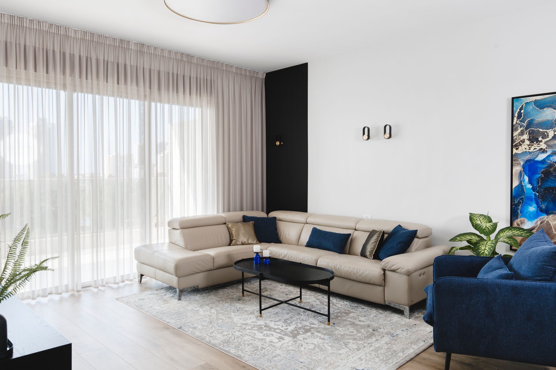 הגוונים השולטים בדירה הם קרם, מוקה, אפור בהיר, חום שוקולד ונגיעות של שחור. כדי לחבר את פנים הדירה אף יותר עם הנוף הכחול של השמיים בחוץ, בחרנו לשלב צבעים כחולים בטקסטיל, באומנות ובאקססוריז.