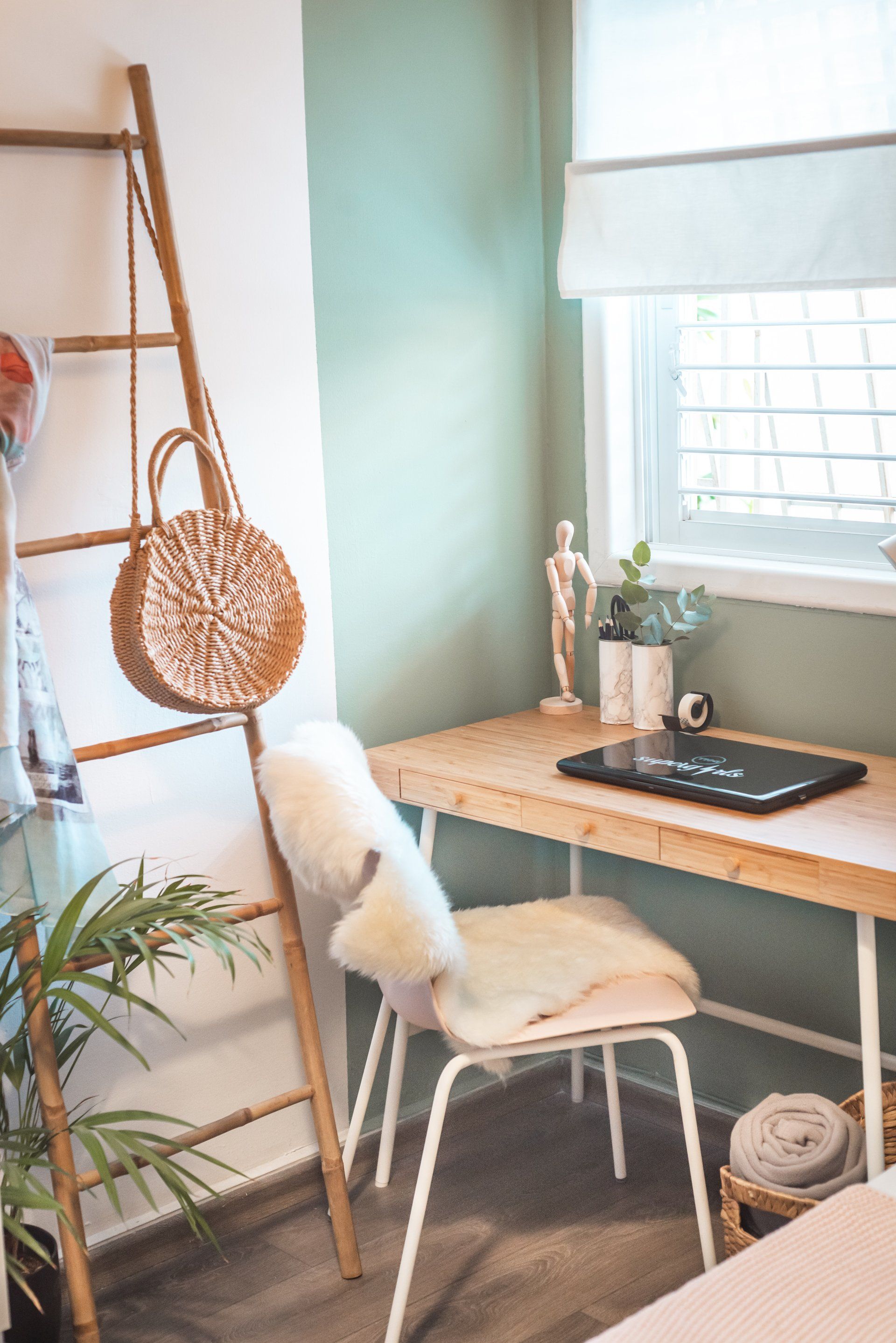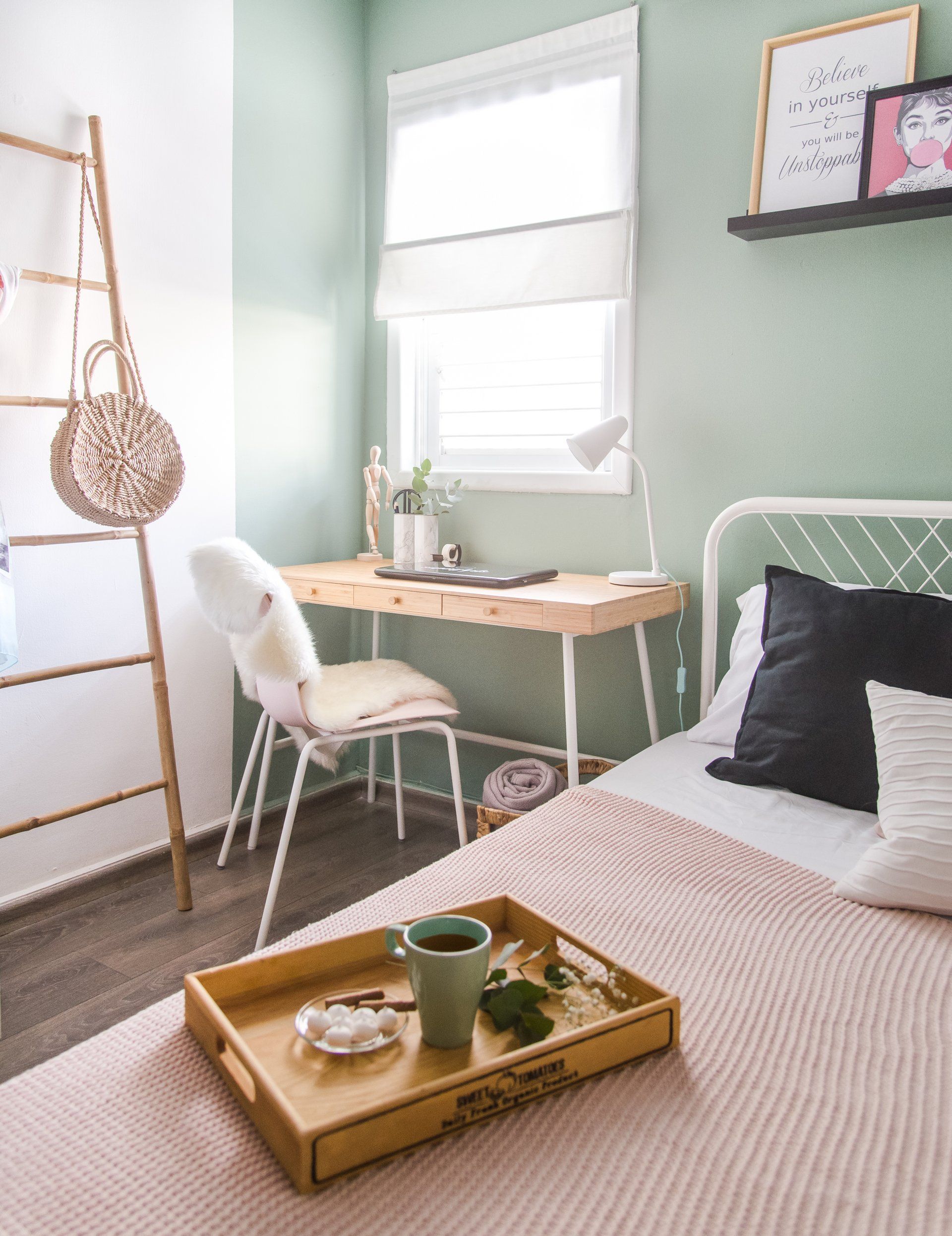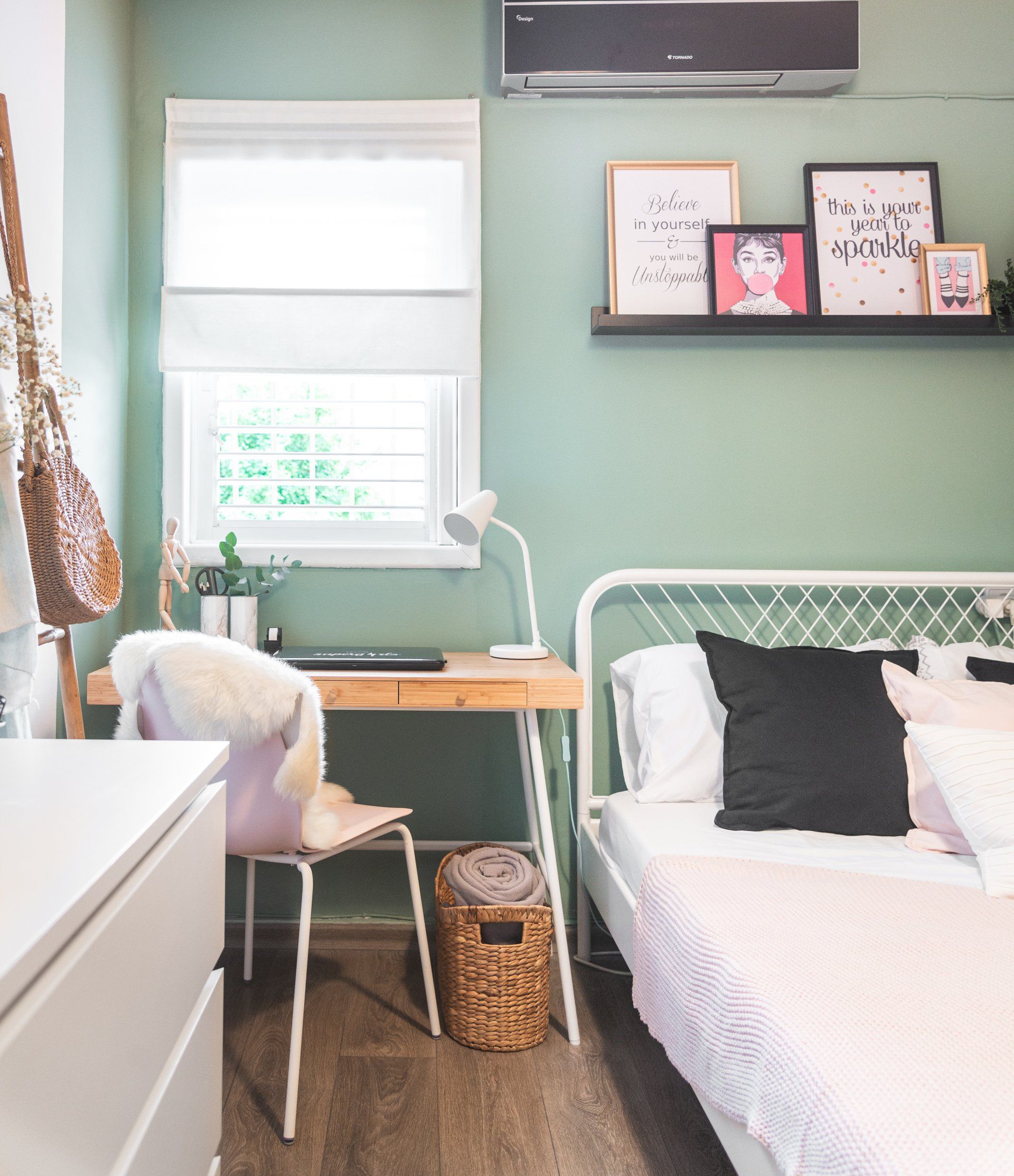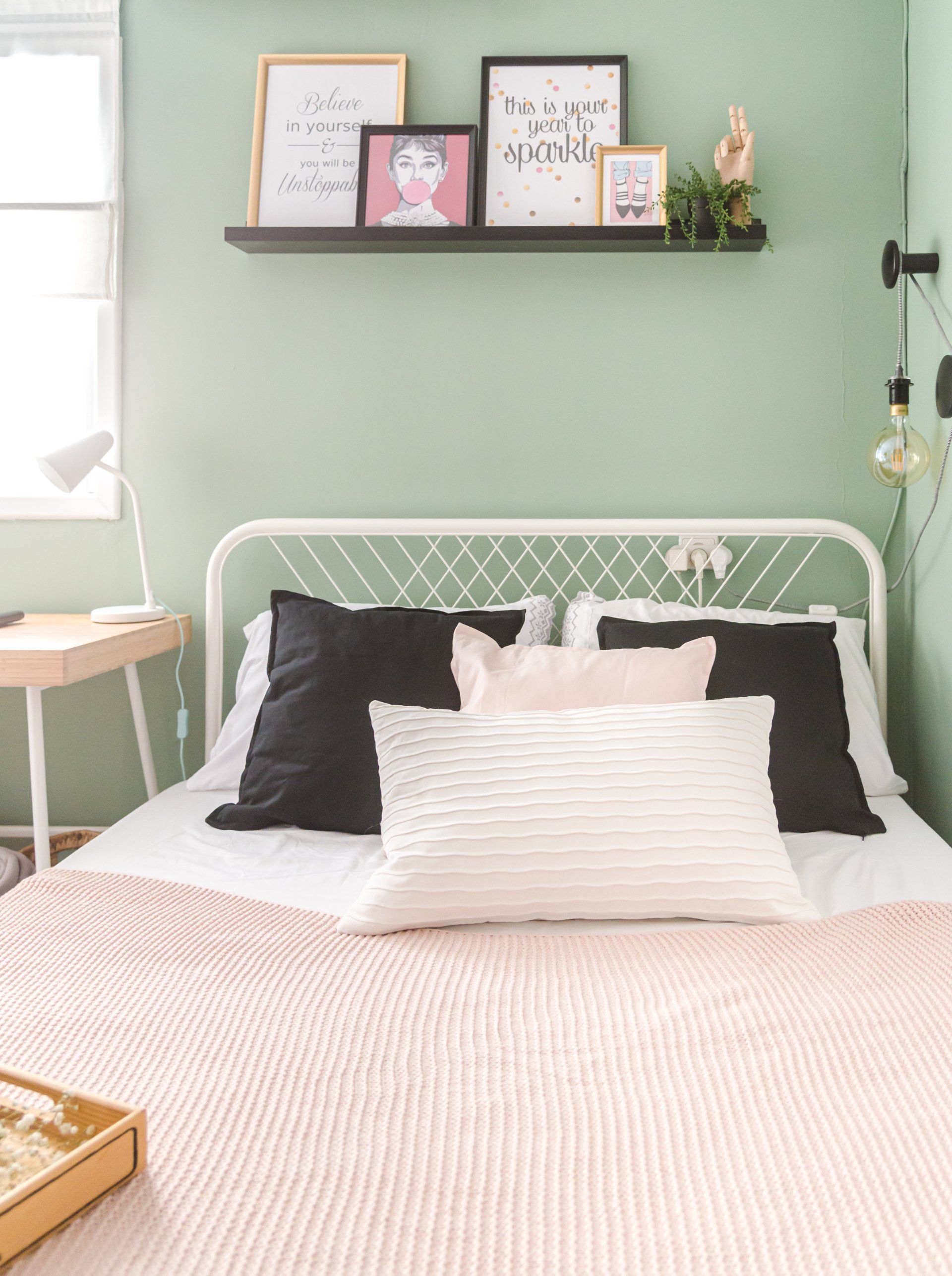 כטוויסט, יצרנו מסגרת צבע על הקיר של גב המיטה בצבע ירוק עמוק המפיק לנו תחושה של עומק ועניין.