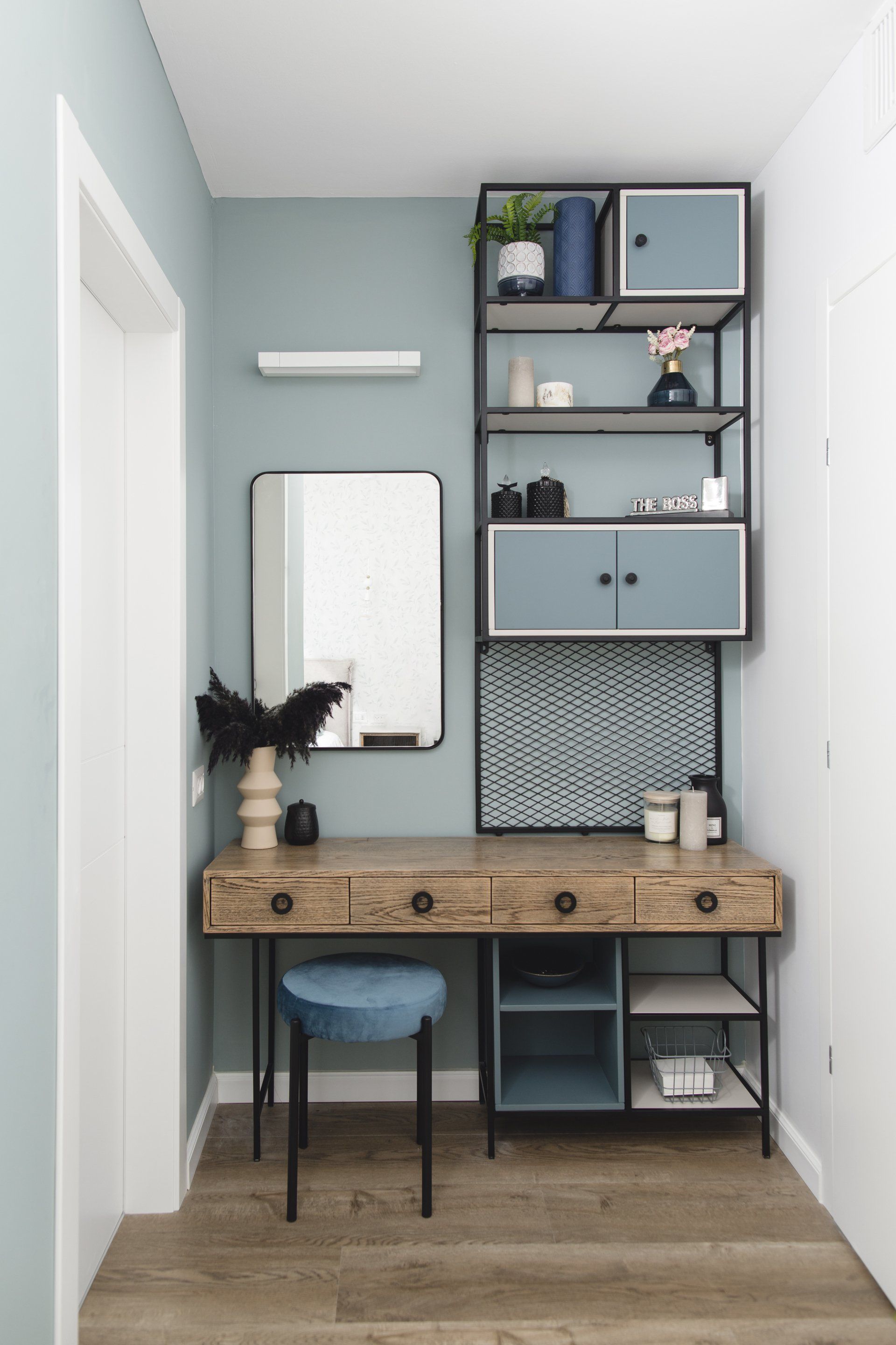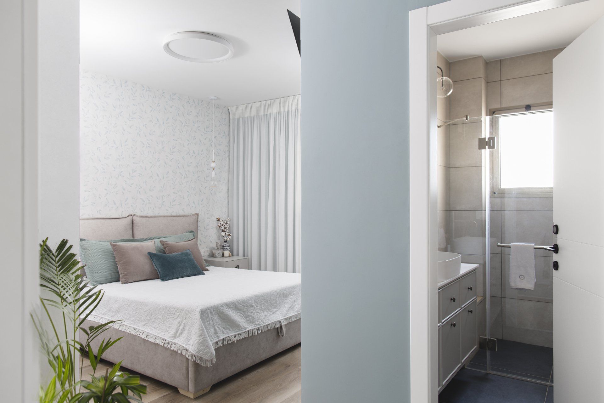 בנוסף, אחת הבקשות של הזוג הייתה שהחדר יהיה רגוע ורומנטי וירגיש כמו סוויטה מפנקת בבית מלון, לכן, פלטת הצבעים שבחרתי הייתה בגווני תכלת ומוקה, צבעים שהם על זמניים ועונים על הדרישה בצורה מושלמת.